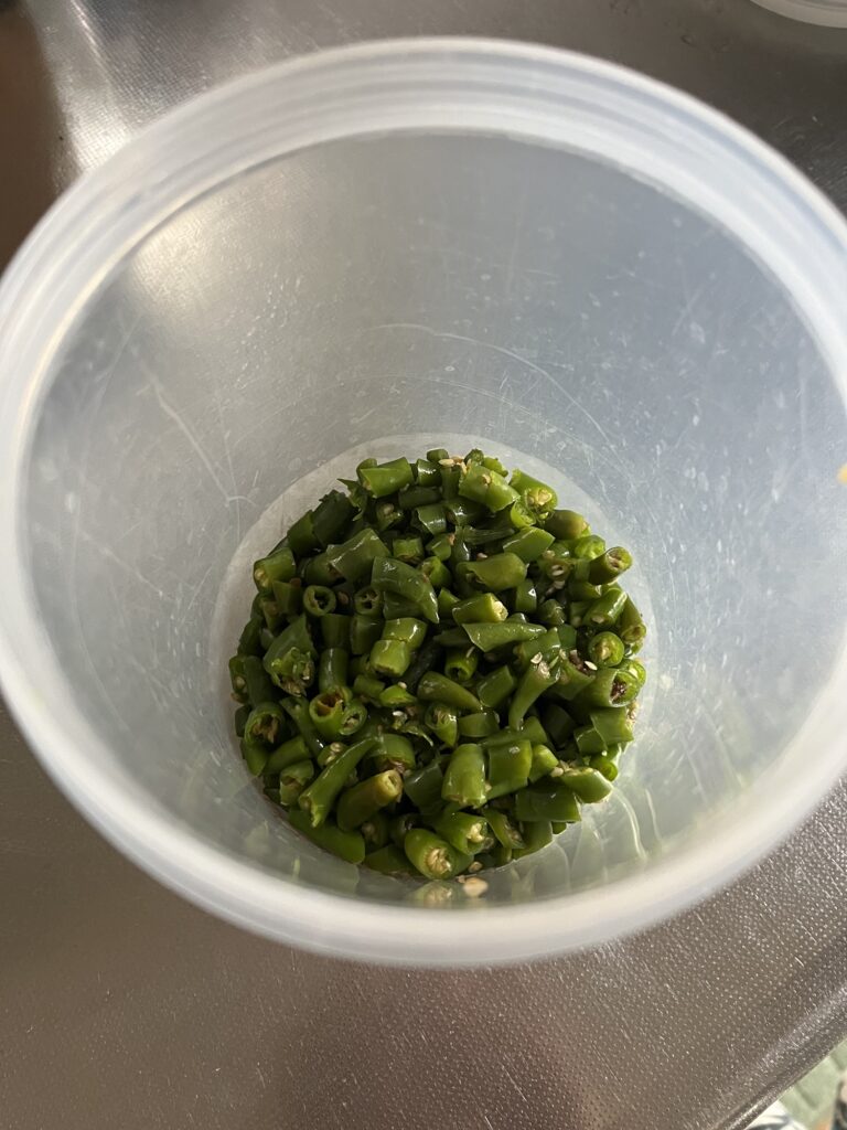 みじん切りにした青唐辛子と、塩分と搾り汁とを
